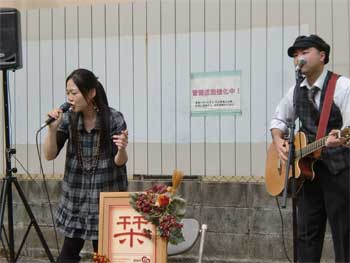 熱唱してます。足元のミュージックストリートの看板と、栞ボードの色合いがいい感じで調和してます。